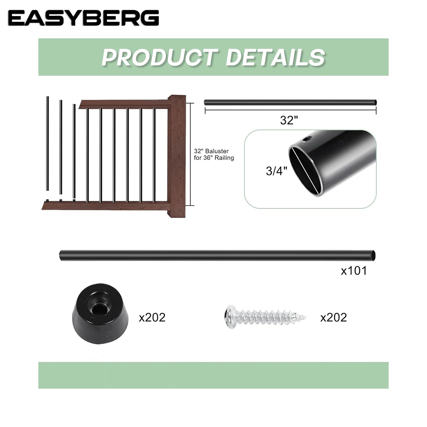 101 Pack 32 Inch Aluminum Deck Balusters 3/4" Diameter Hollow Round Balusters for Deck Railing Deck Spindles with Screws for Railing Fencing Balusters Staircase Spindles with Connectors