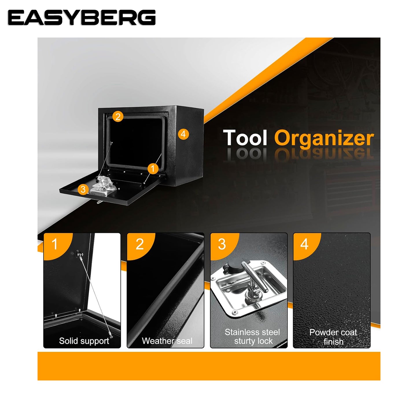 - Overall dimensions include: 24"(L) x 18"(W) x 18"(H). Sized to fit most truck underbody or truck bed, allowing easy organization of tools and accessories.