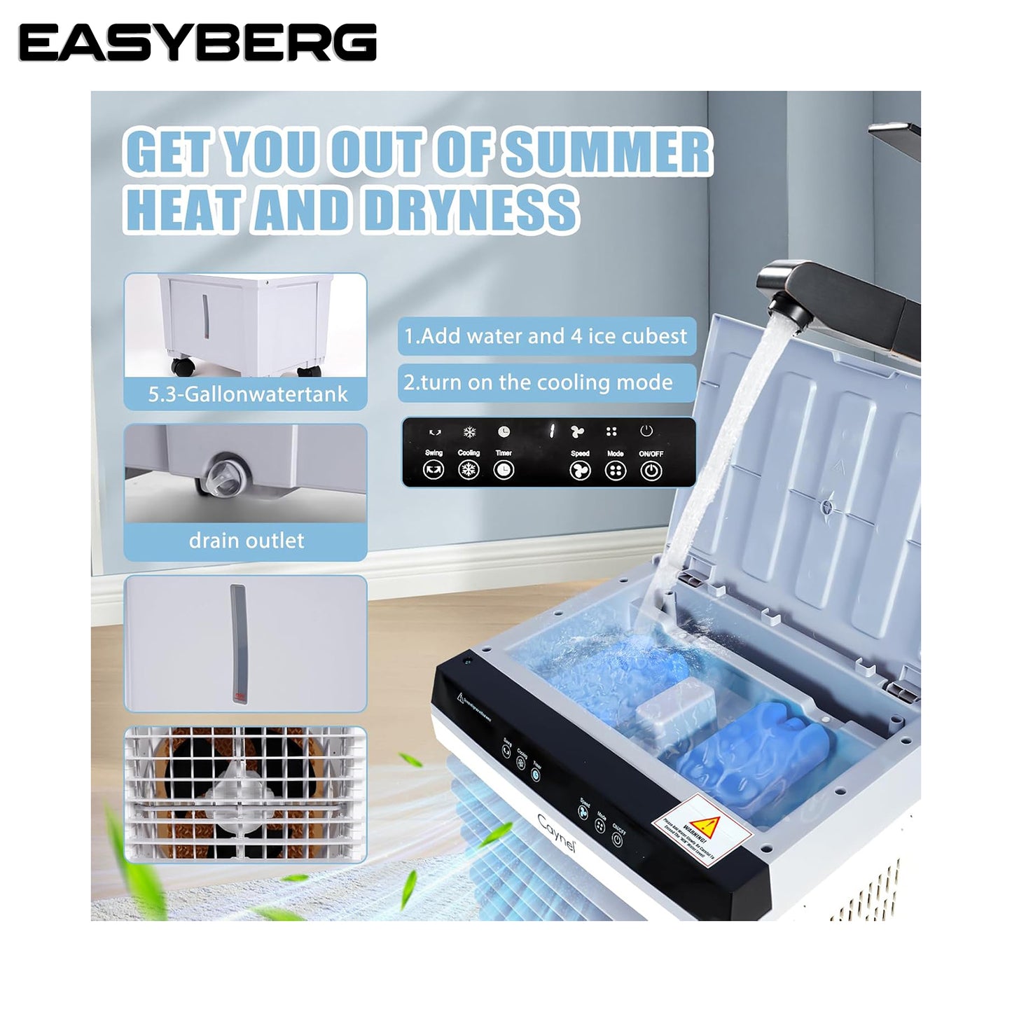 - 【5.3 Gallon Water Tank】Built-in a spacious 5.3 gallon water tank, allowing the air cooler to run for hours without refilling the water. In addition, the practical water level window allows you to see how much water is left in the tank at any time, ensuring timely replenishment. The CAYNEL Swamp Cooler comes with ice packs to bring you cool air.