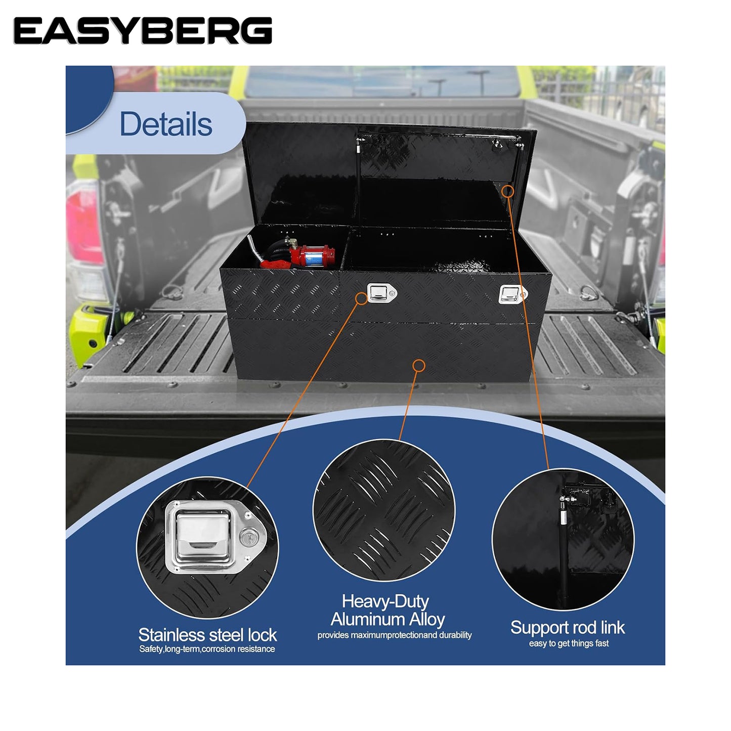 - Heavy-duty aluminum tool box, Fully welded seams