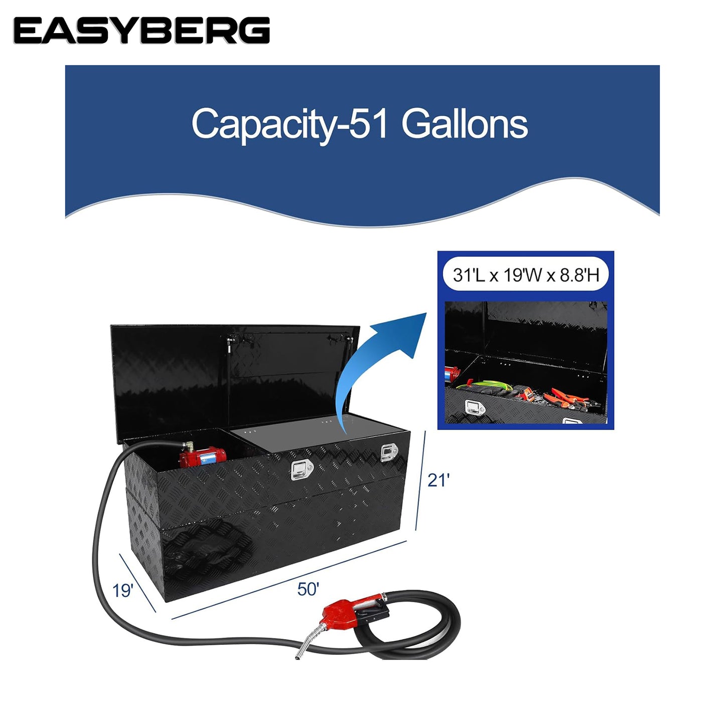 Fuel Transfer/Auxiliary Tank/Toolbox Combo with 10 GPM Pump, Auto Fueling Nozzle, 13FT Hose, 51 Gallon