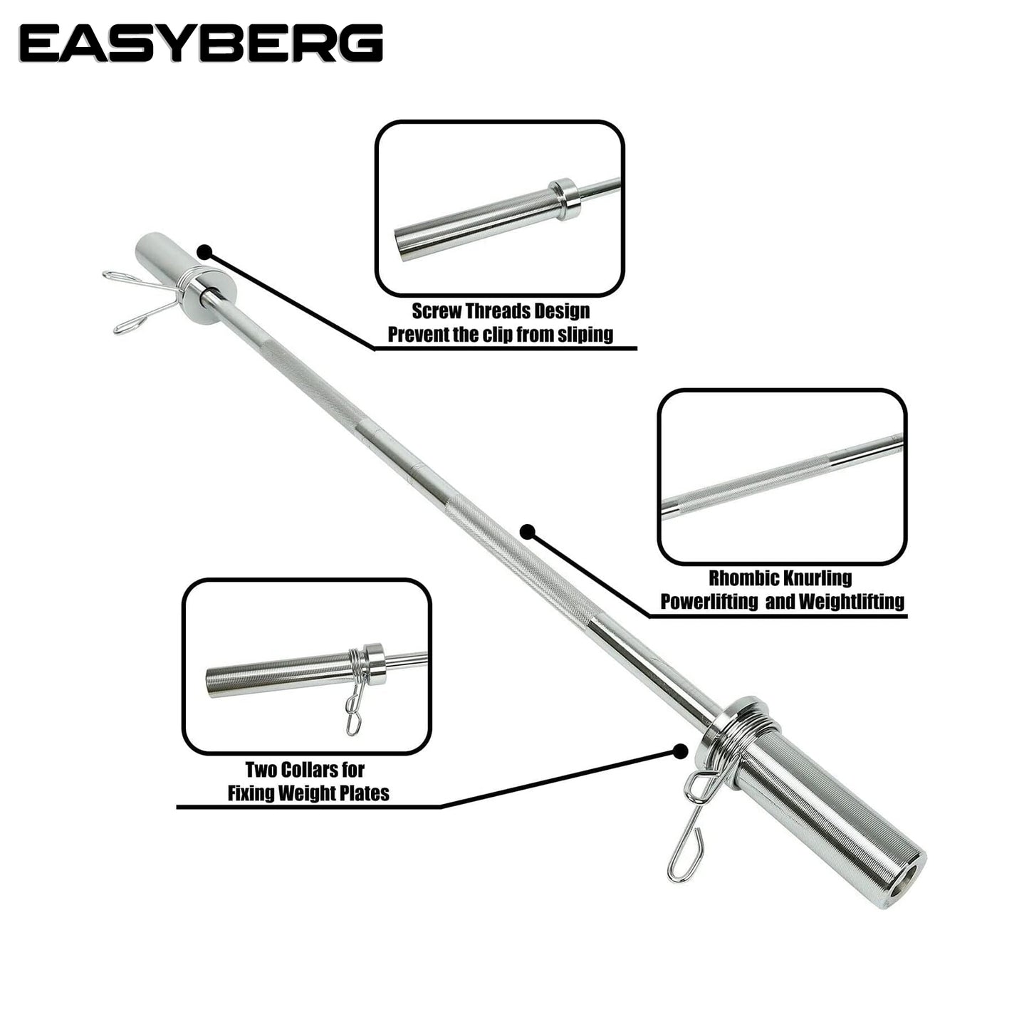 - Bar is chrome plated with solid steel construction for repeated use and long lasting. 2” Spring Clips good for reducing pressure on wrists and forearms and for loading all types of 2 inch Olympic barbell plates.