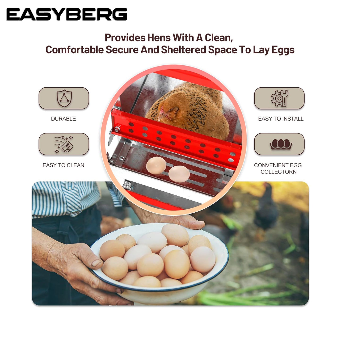 - DURABLE: Our egg layers are made of galvanized steel, which prevents rust and rot, and the smooth surface is easy to clean and guarantees long-lasting durability.